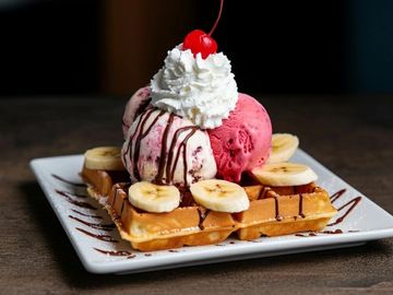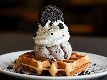 Waffle , cookies and cream ice cream crumble cookies cream chocolate drizzle